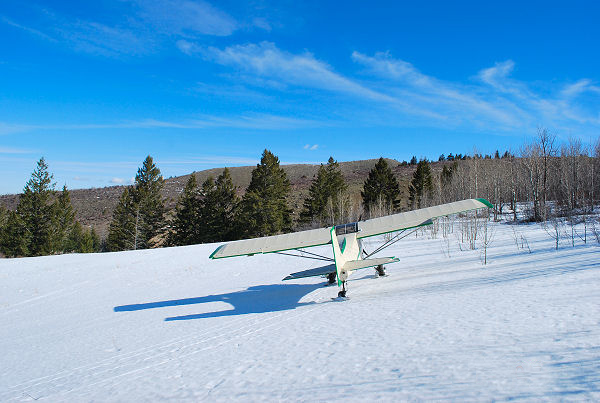 Tom Simko flies his Rans 7 over the Idaho mountains enjoying the freedom Datum wheel skis provide.